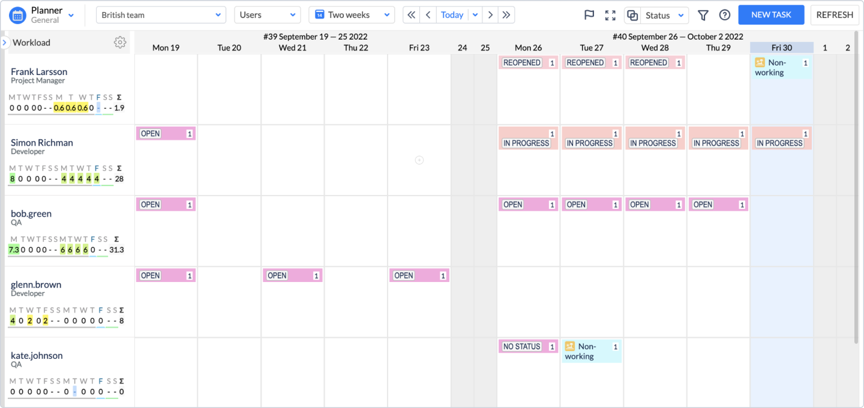 Per Status aggregation helps track the position of an issue in its workflow on the timeline. You can easily see which tasks are already in progress or are scheduled for the past but not completed yet and etc.