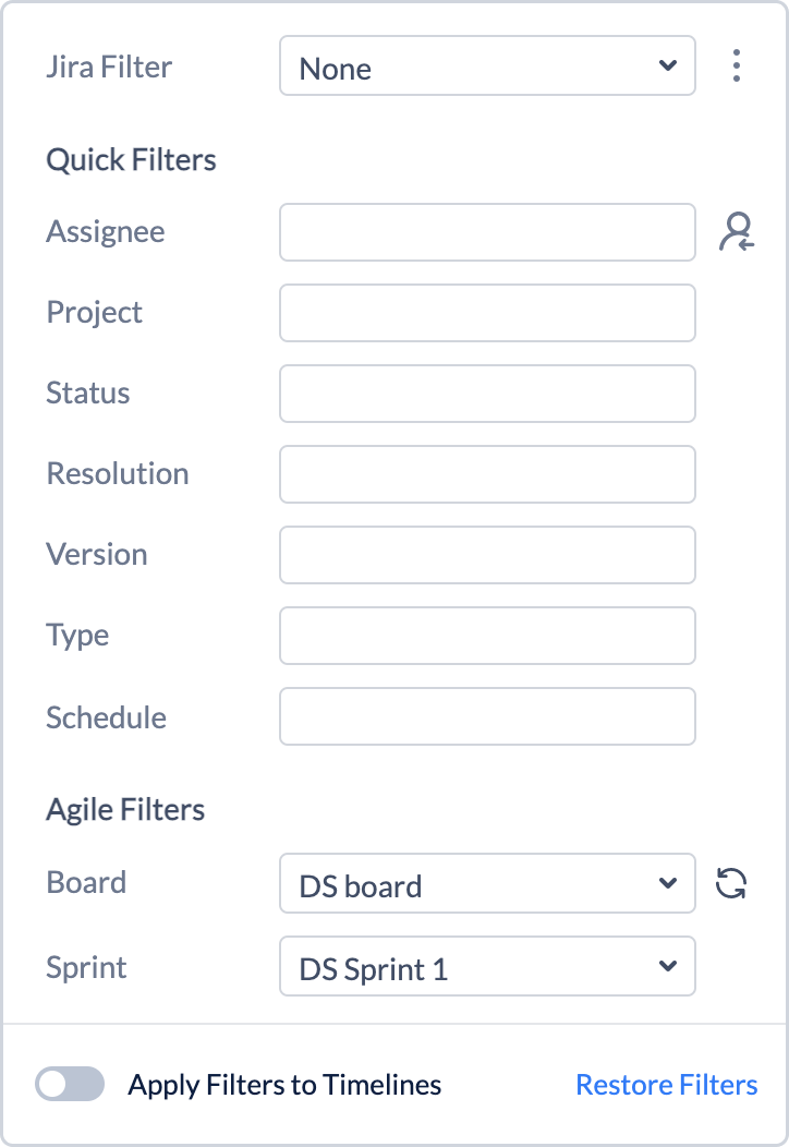 If a user has any filters saved in Jira, he/she can filter the issues in ActivityTimeline by selecting the corresponding filter.