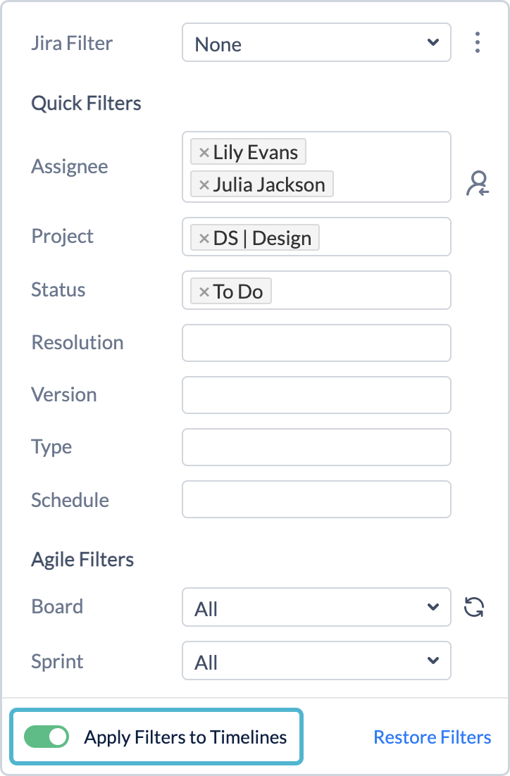 One can apply filters from the left Issues panel → Filters to the right Timeline panel. To have a timeline apply to all the set filters, a user has to:
