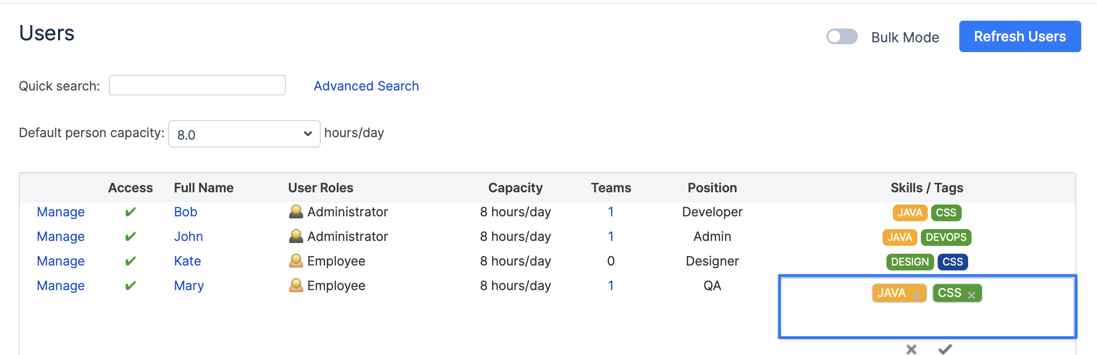 We recommend opening Configuration → Users → Bulk mode to assign users to roles in bulk and avoid manual work (can also be used for positions and skills).