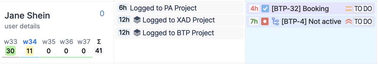 Worklogs can be displayed on the timeline and are taken into account in workload calculation for past and current periods, also it’s possible to configure the system to allow work logging into the future days (switched off by default).