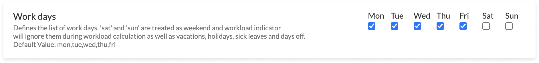 Yes, it is possible to change which days should be considered as working by the system, for this go to ActivityTimeline Configuration → Workload Indicator → Change ‘Work days’ configuration: