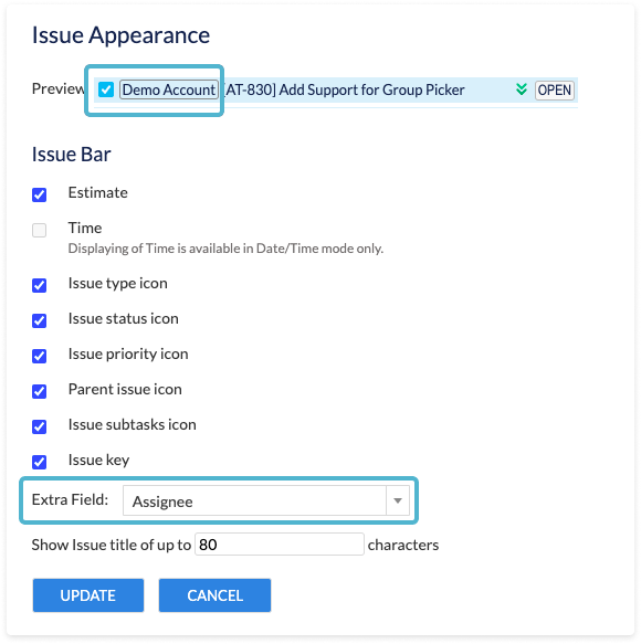 Go to ActivityTimeline Configuration → Jira Integration → Planned Issue Start Date/ End Date from the dropdown choose your Start/End date fields → Click on the ‘Update’ button: