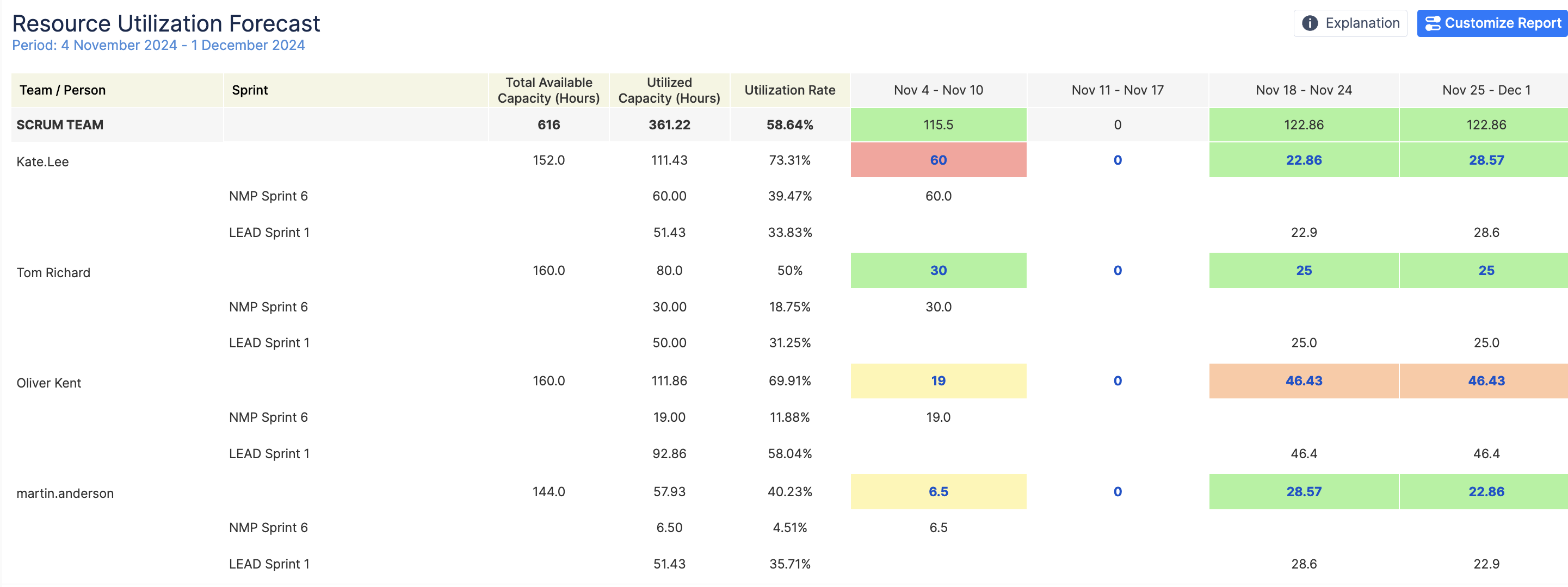 We recommend you try our Resource Utilization Forecast which can show you the utilization of your resources as well as their potential availability. You can generate it in hours or percentages, and in Web or Excel format: