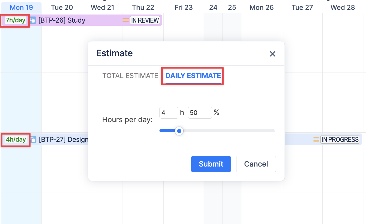 When a task has both Remaining Estimate (or Story points) from Jira and Daily Estimate assigned, hours per day number will be shown on the ticket and the workload will be calculated based on that number.