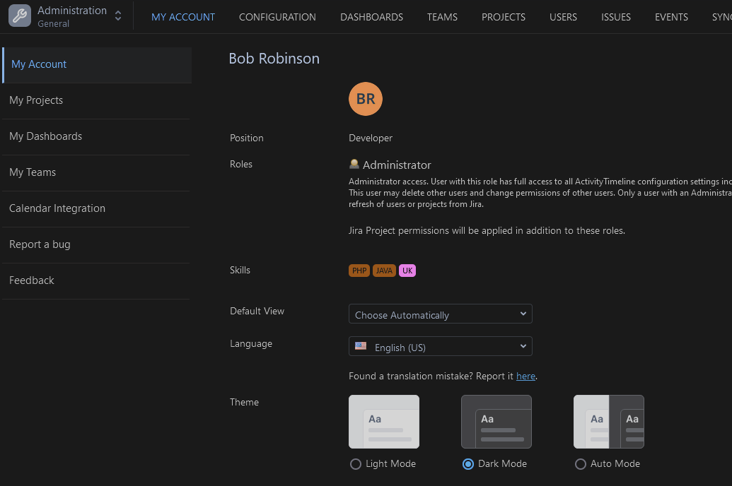 Jira Data Center/Server users can manually choose either Light or Dark mode in ActivityTimeline Configuration → My Account Menu.