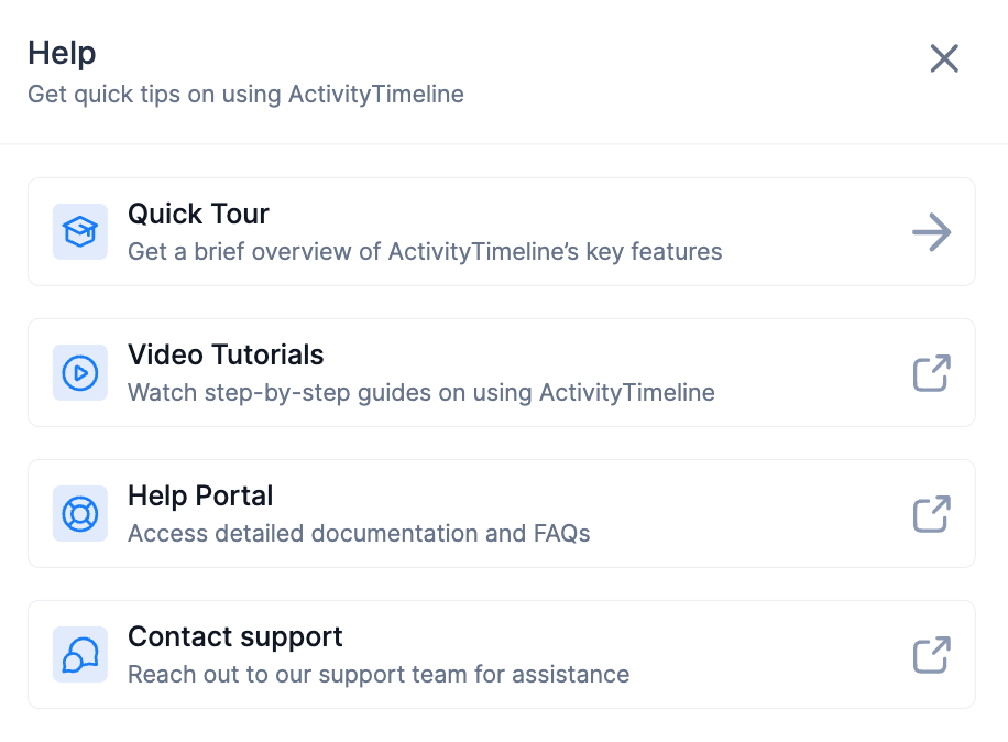 Quick Tour: A brief walkthrough to get you started quickly. Each module includes its own tailored tour for focused guidance.