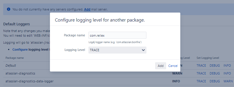 1. Turn on TRACE logging for “com.reliex” package in Jira: