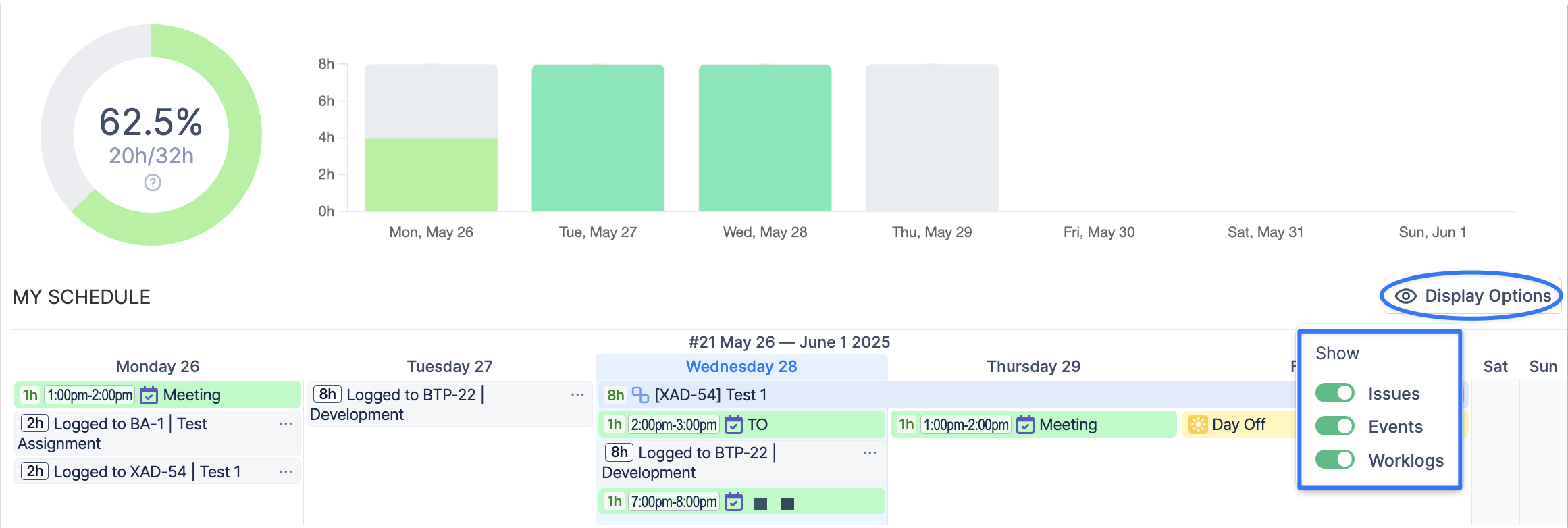 Individual Timeline Panel: View, create, edit, and delete Jira tasks and custom events. Log work directly on the timeline and see assigned tasks scheduled for the user. Drag-and-drop worklogs or resize them. Use Display Options setting to view only Issues, Events or Worklogs at once: