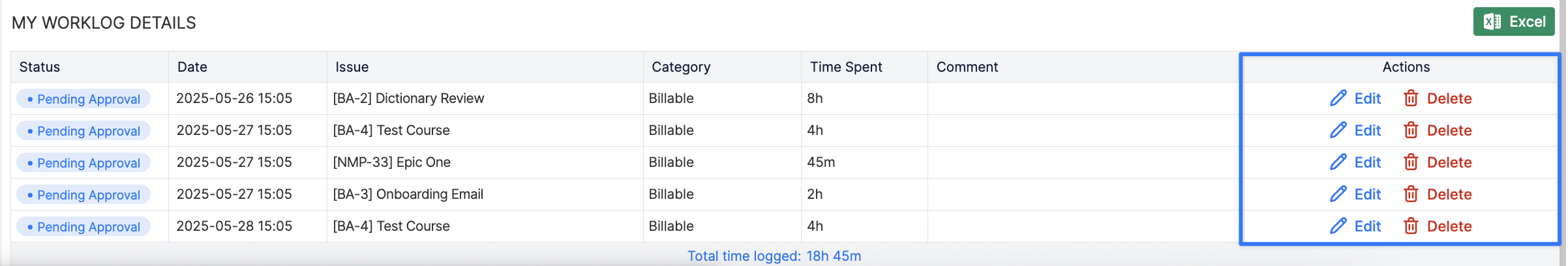 My Worklog Details Table: Track and manage logged work hours, including editing dates, times, and comments on work logs.