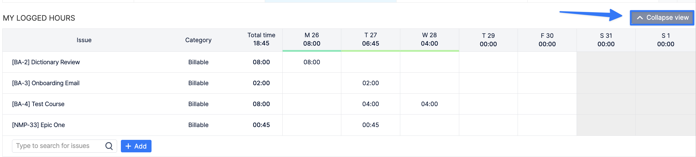 Logged Hours Table: The table holds logged hours per day and is collapsed by default. With a simple 'Expand view' button you will see detailed information on all issues worked on during the current period. This also allows for quick logging of time on specific tasks and dates, streamlining the time-tracking process.