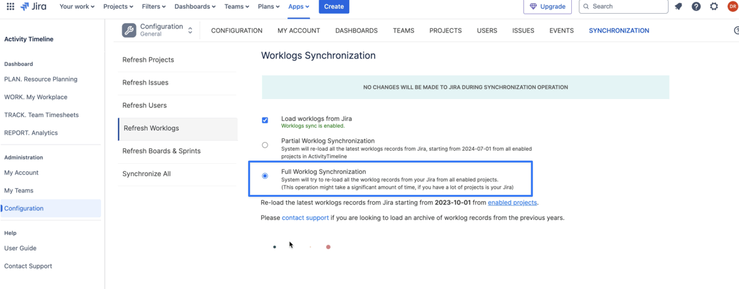 The system will load new worklogs by default. If you would like to retrieve previous Tempo worklogs then you would need to re-sync worklogs on ActivityTimeline Configuration → Synchronization → Refresh Worklogs → Full Worklog Synchronization.
