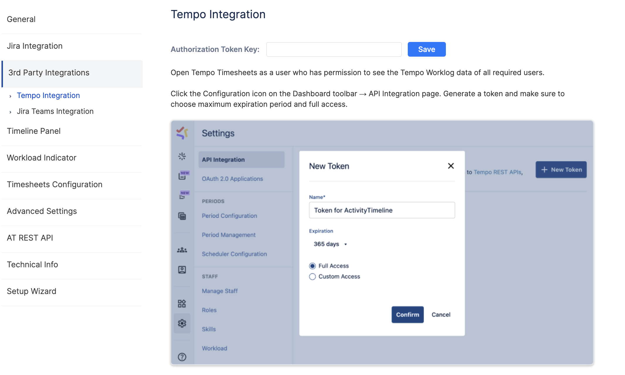 Open ActivityTimeline → Configurations → 3d Party Integration → Tempo Integration tab:
