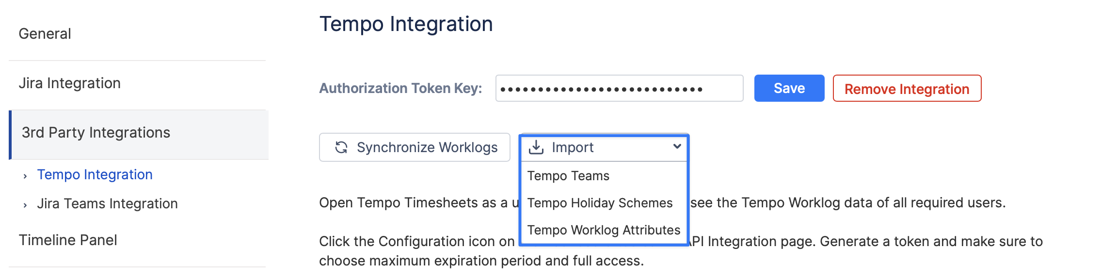 Having the integration with Tempo set up you can also import their teams, holiday schemes and worklog attributes directly from Tempo integration page or through ActivityTimeline Configurations.