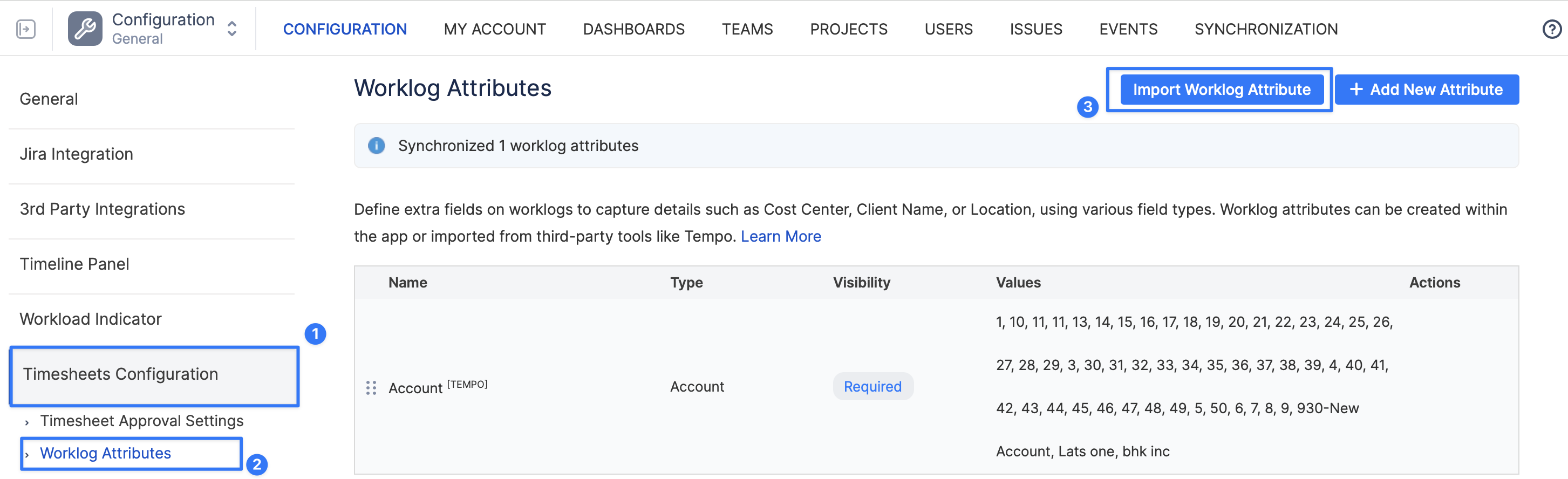 This will sync the worklog attributes from Tempo and make them available in ActivityTimeline.