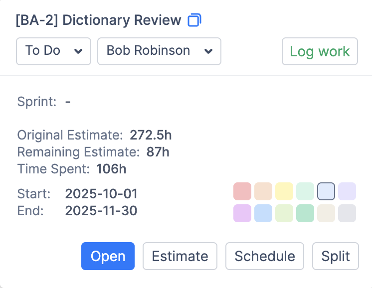 This card also features action buttons, allowing you to perform various actions, such as changing assignee or estimate and setting due dates, all without leaving the current screen.