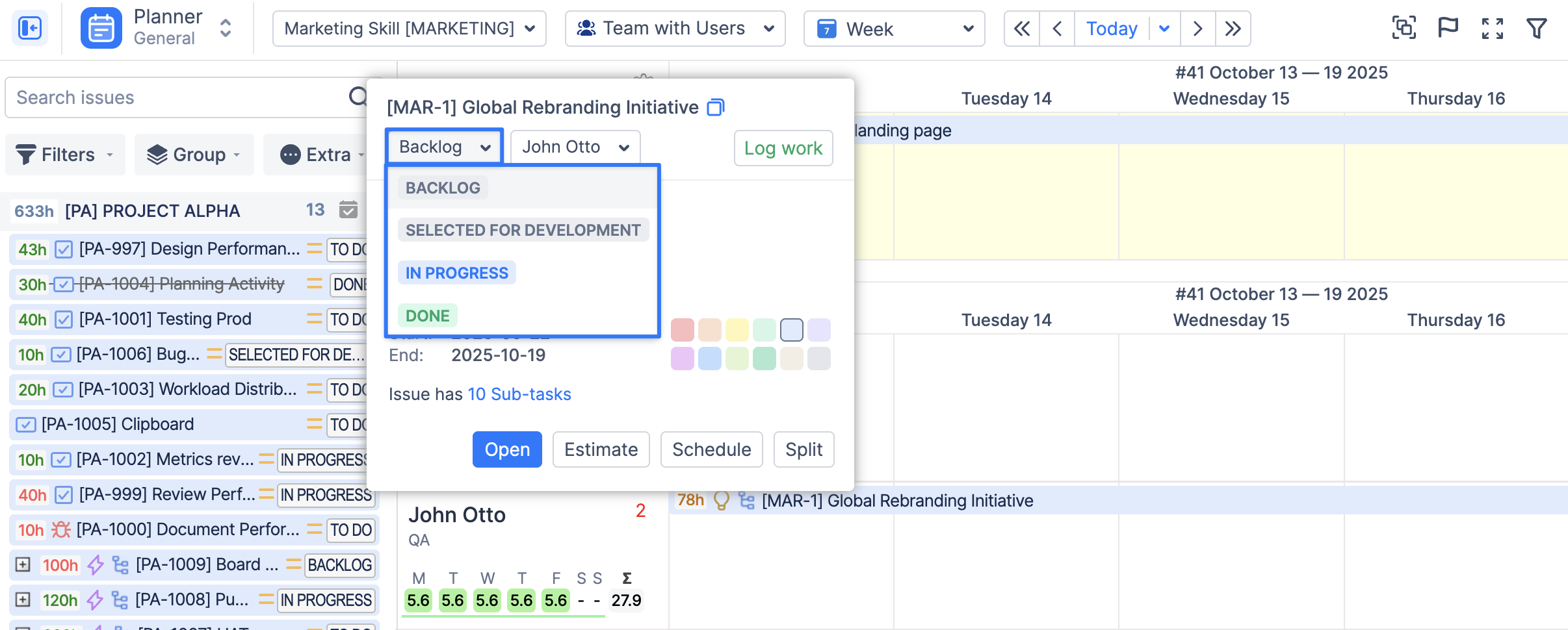 By clicking on the status on the issue card, you can change the status of the task. The change will be synchronized back to Jira.