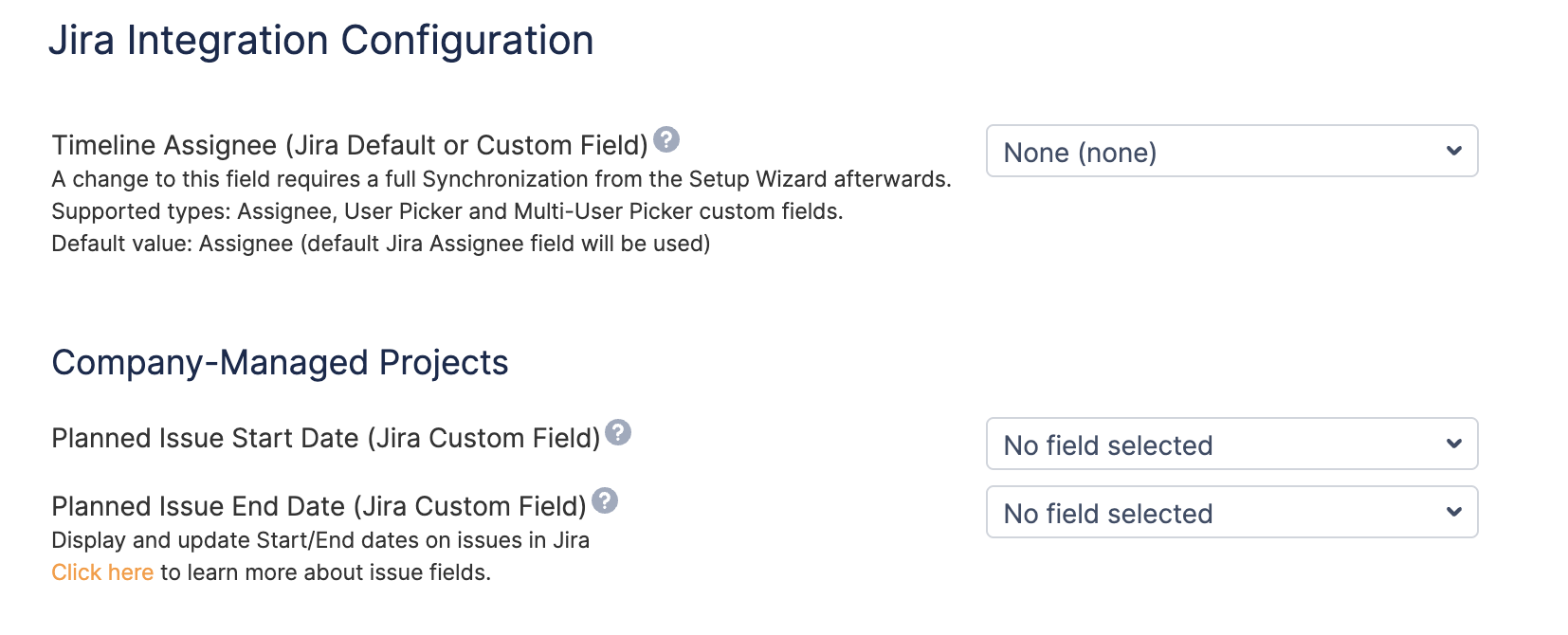 By default, ActivityTimeline connects to Jira using ‘Assignee’ and standard ‘Start Date' and ‘Due Date’ fields.