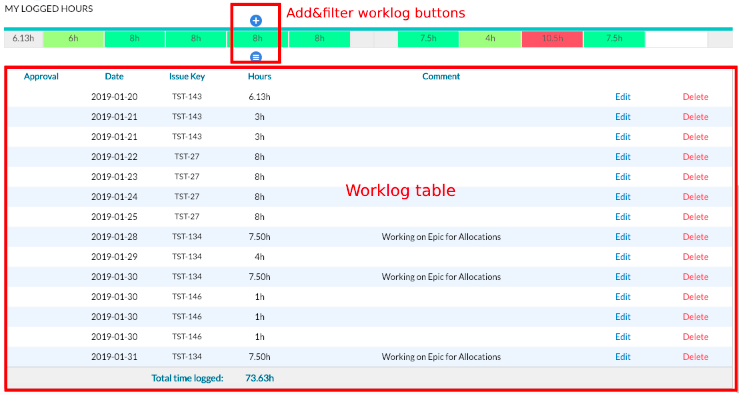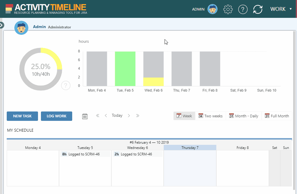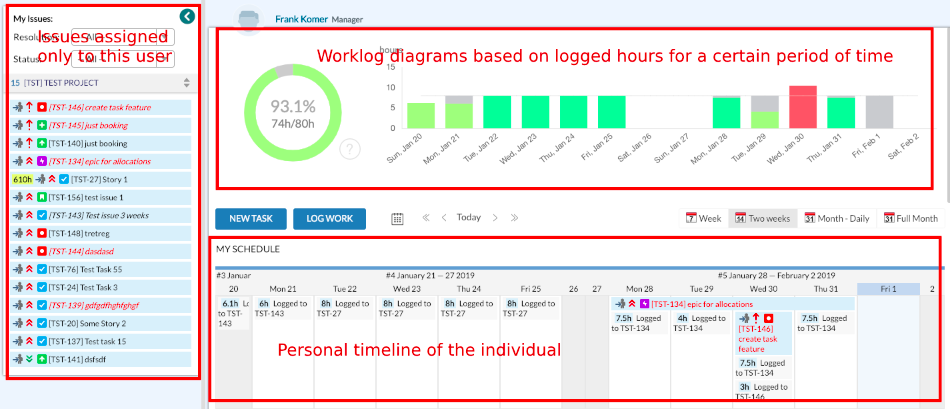 Personal Workspace of Employee, where they can check their schedule, what's planned for them, log worked hours, edit/delete own worklogs (if their Jira permissions allow), see graphic charts based on their worklogs