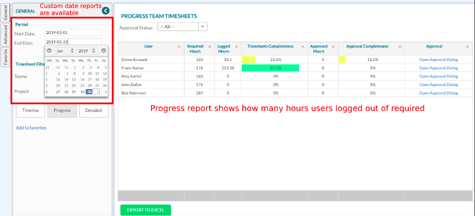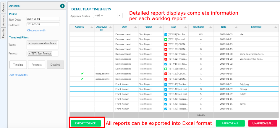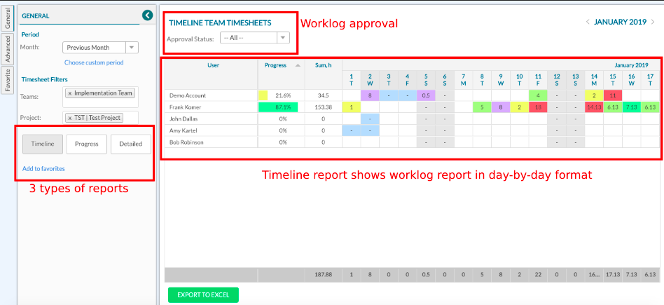 Timesheet reports, that allow managers to track work of team members based on the worklogs that they submitted. There will be 3 different types of display modes: Timeline, Progress, Detailed
