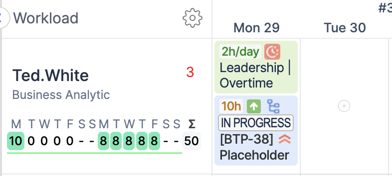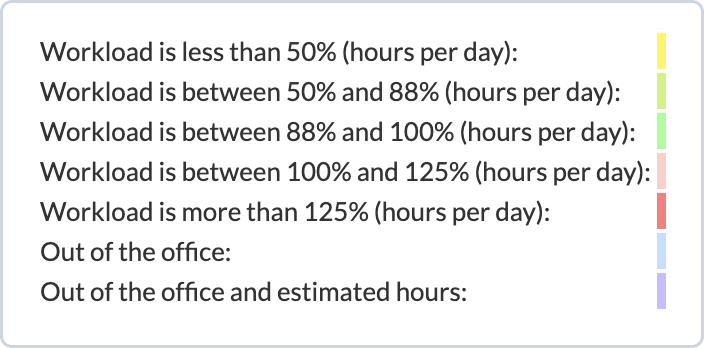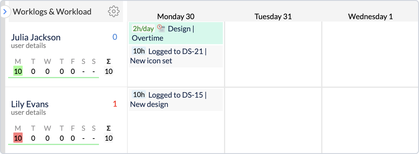 Normally, 10 logged hours per day are marked in red color (more than 125% h/day) because of the standard involvement of 8h/day. However, due to the 2 hours of Overtime, 10 logged hours will be marked in green color (between 88-100% h/day).