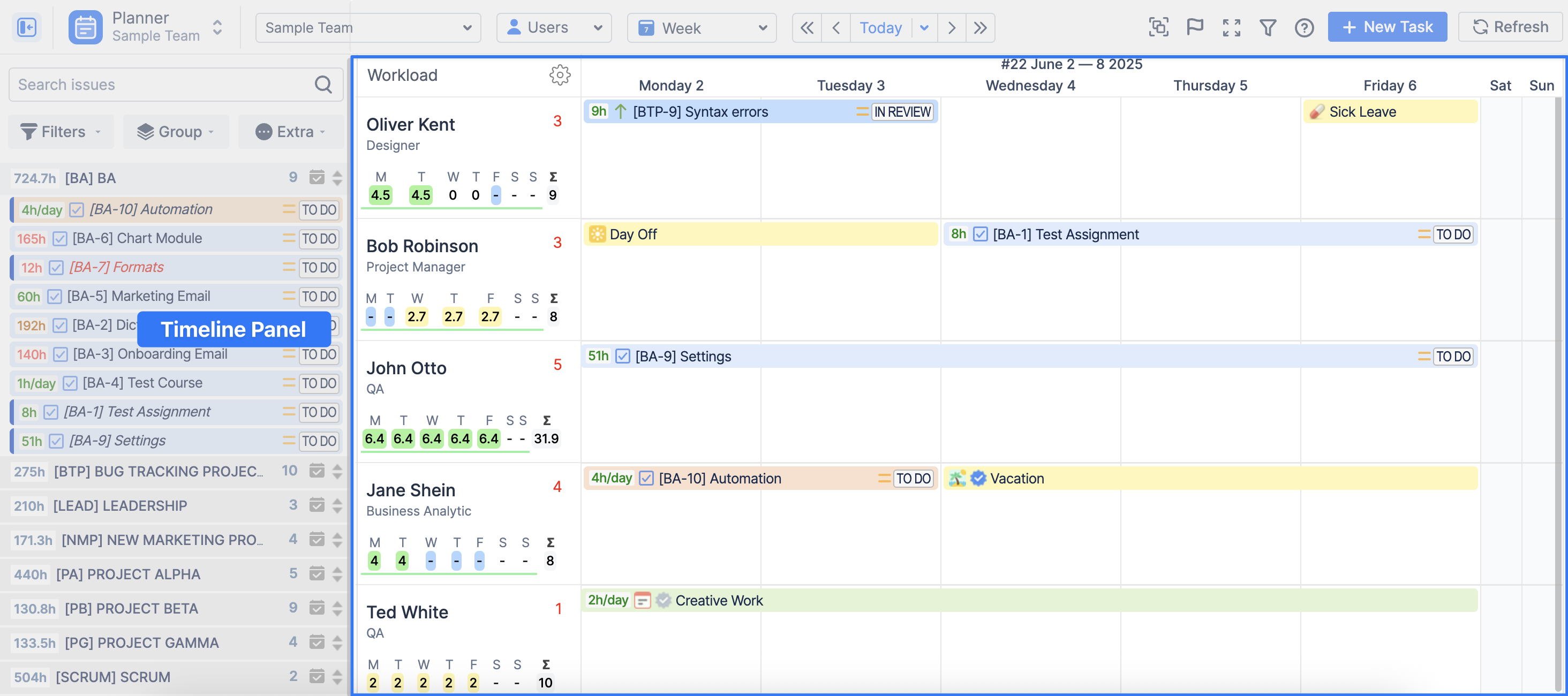 Timeline Panel allows managing the current and future tasks. It has a calendar view with each row corresponding to one person with his/her timeline, and each column corresponding to a particular day of a week or week of a month.