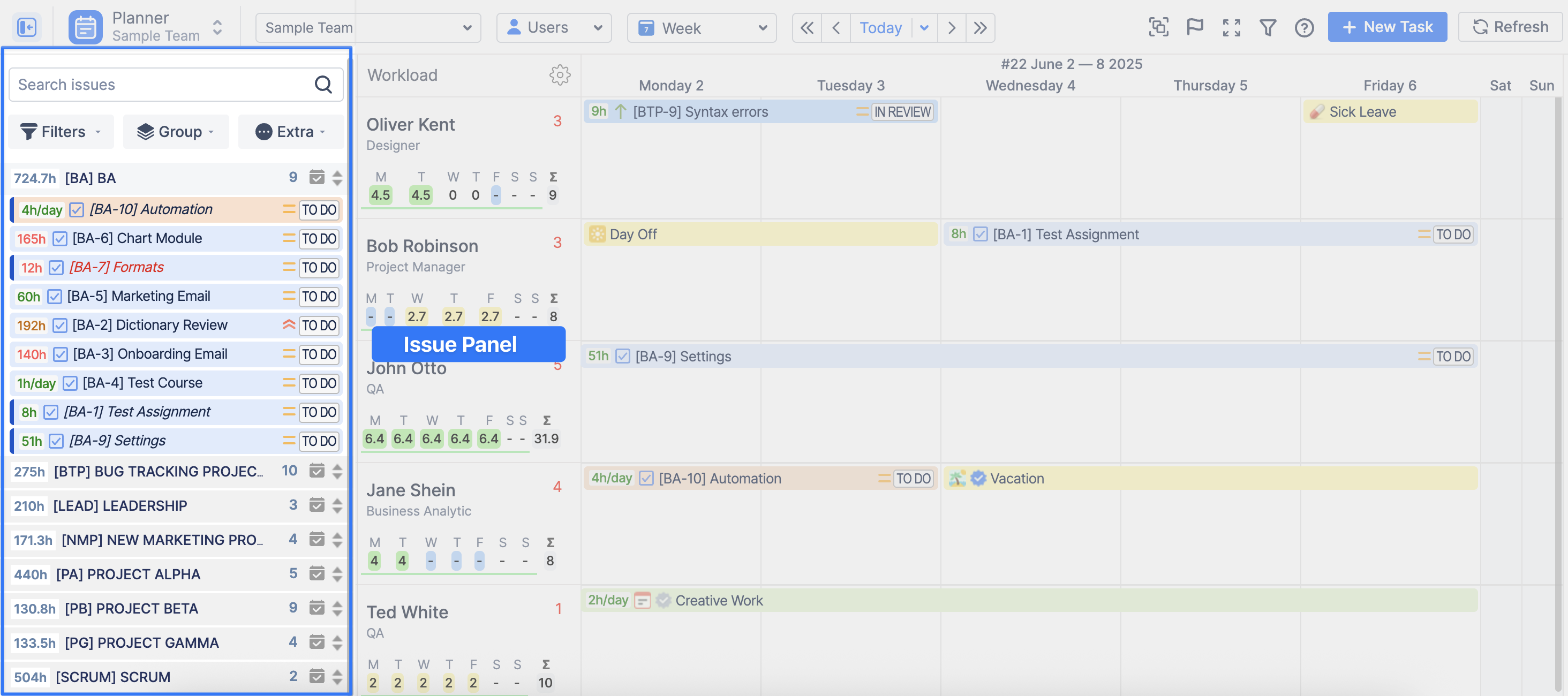 Planner consists of two main parts: Issues Panel on the left and Timeline Panel on the right.