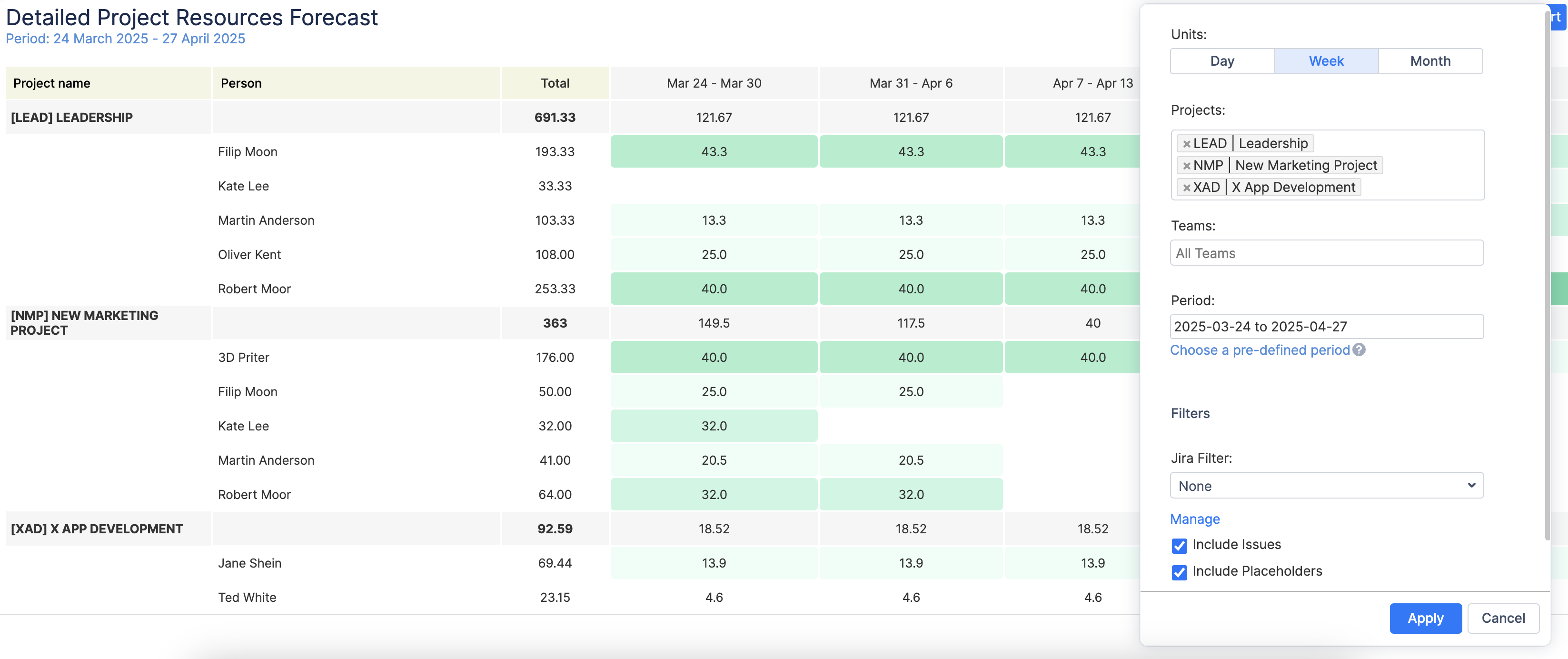 Customization: You can filter the report by specific projects, teams, and Jira filters. It also allows you to choose whether to include issues, placeholders, and booking items for a comprehensive view of resource allocation.