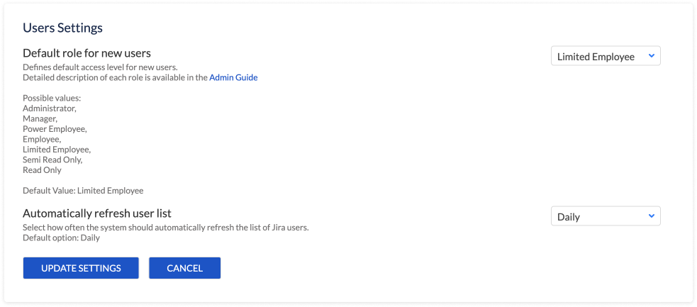 You can also configure how often the system should sync new users from Jira to ActivityTimeline and what User Roles and Permissions assign them after they are synced into the system.