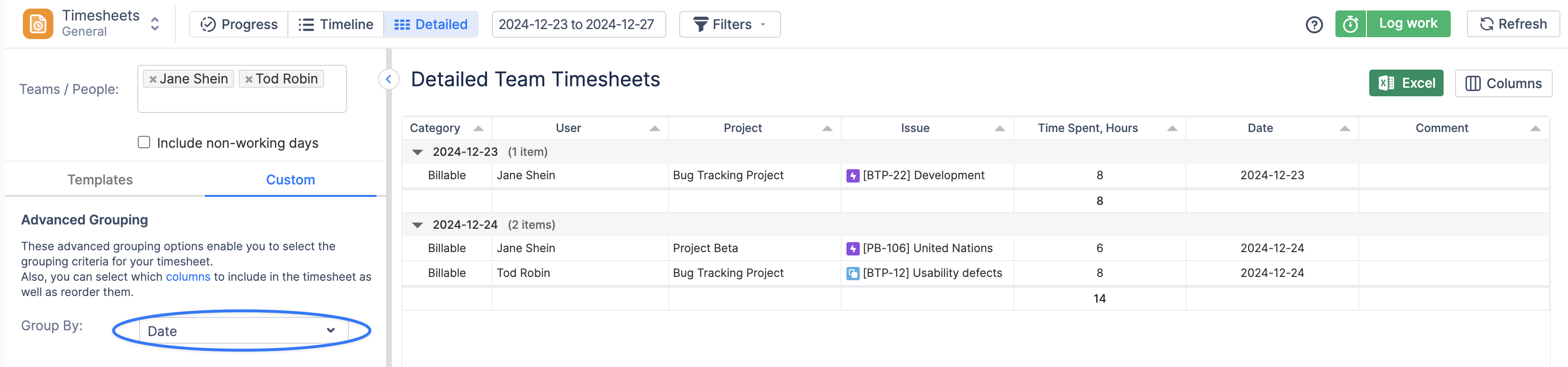 Enhanced Timesheets: Grouping by date has been added to improve clarity and simplify timesheet analysis.