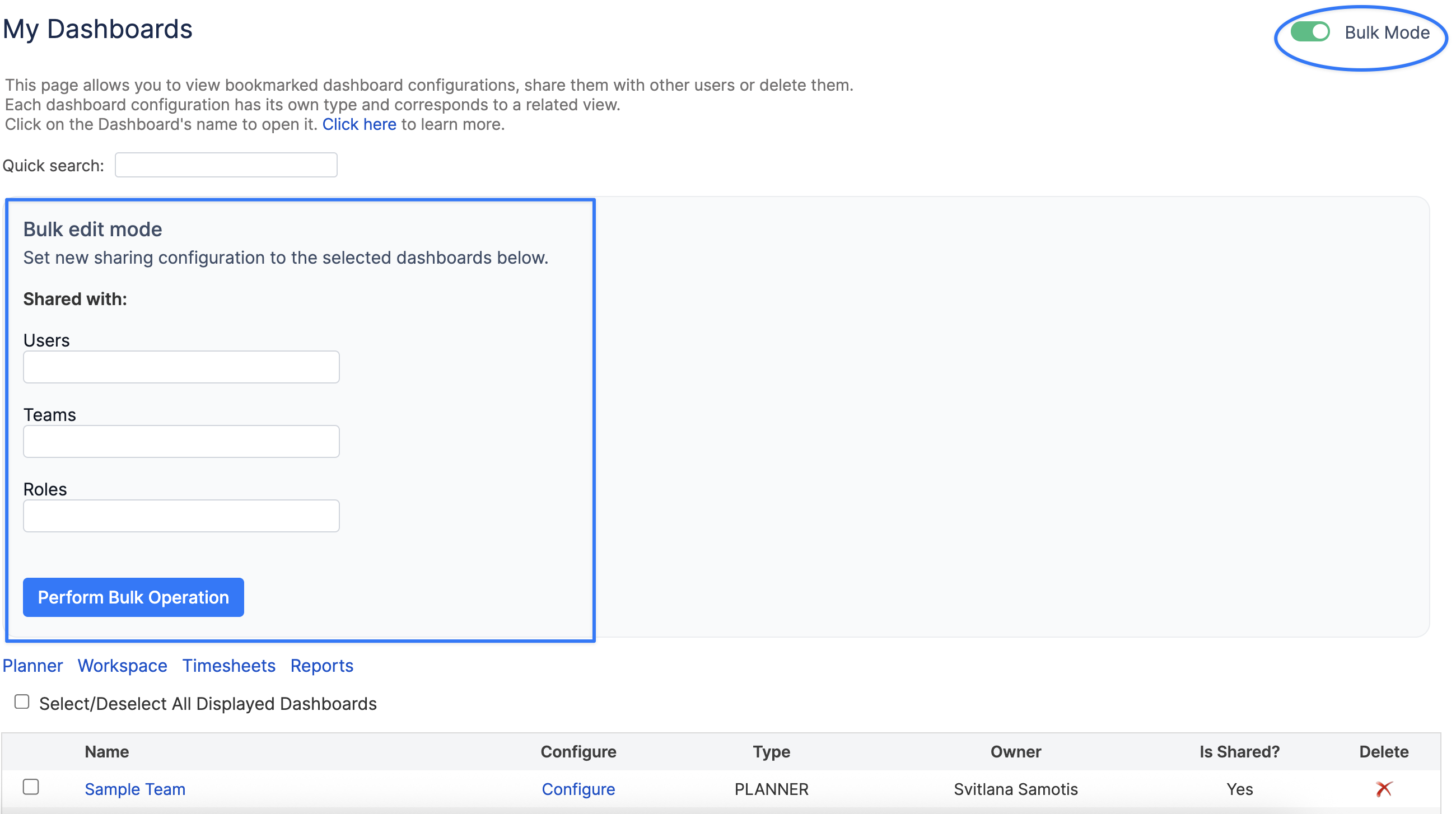 Enhanced sharing option for dashboards in ActivityTimeline by adding bulk options: