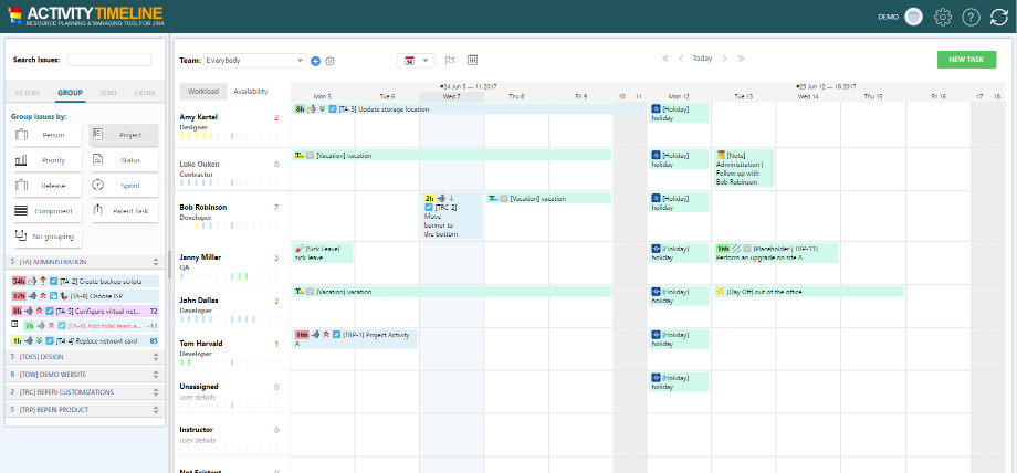 - Automatically group issue worklogs records per issue/project depending on the timeline scope