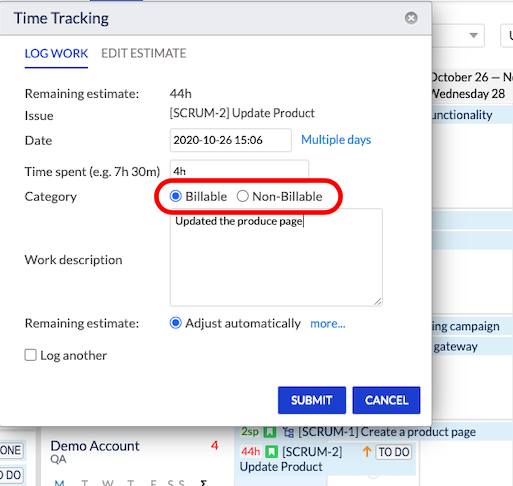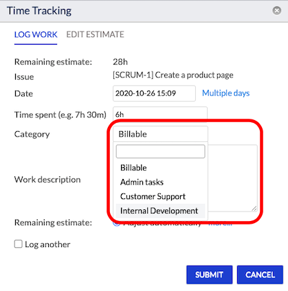 Worklog Categories to categorize logged work hours (e.g. Billable vs Non-Billable work)
