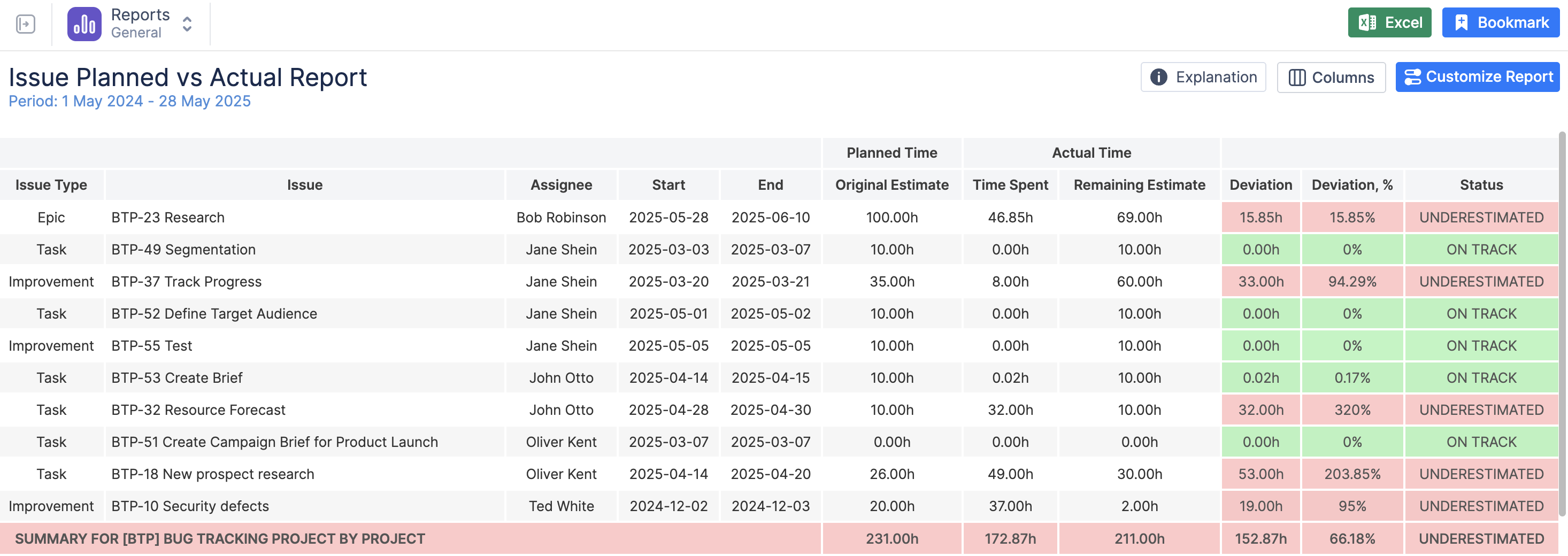 With the help of the Planned vs Actual report, you can compare expected results with the actual execution of tasks/projects.