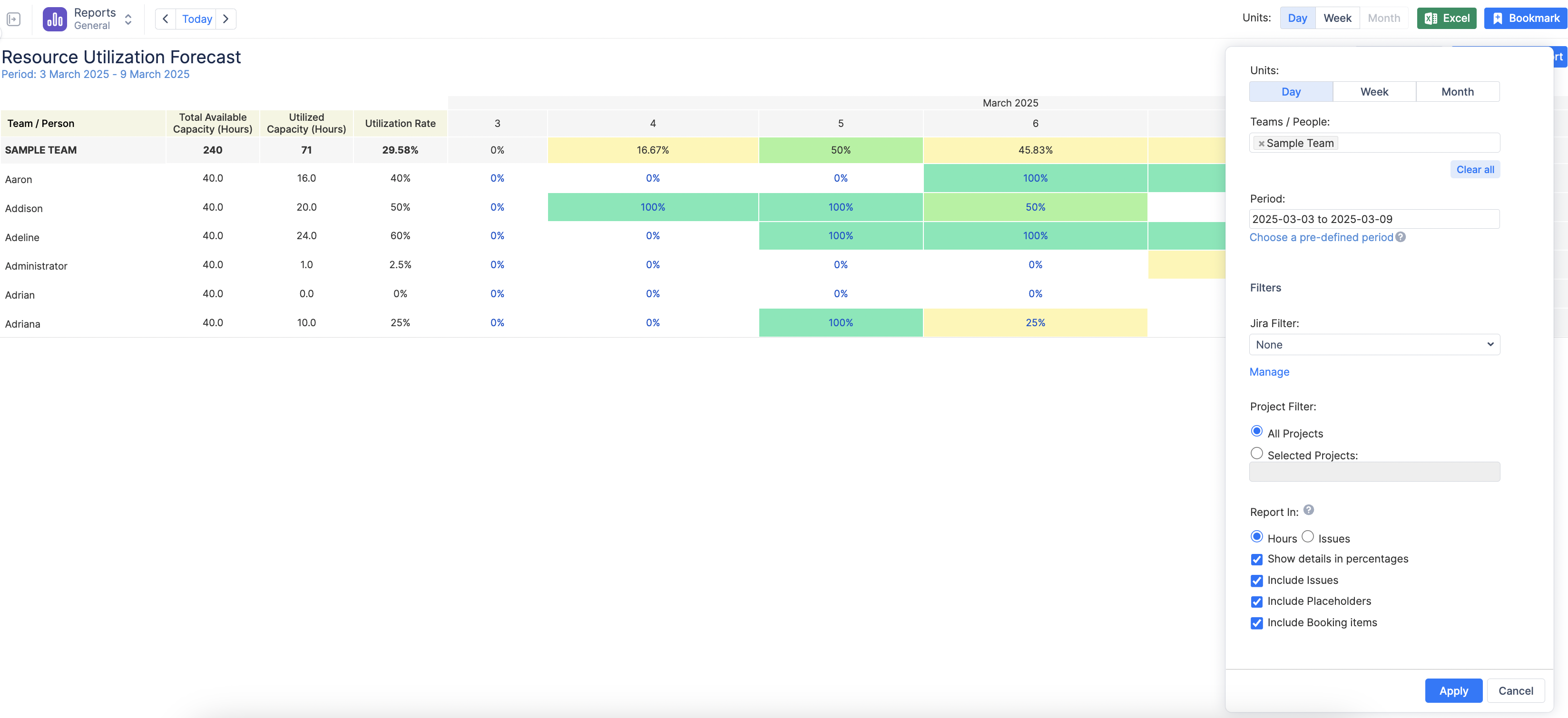 Customization: You can filter the report by Jira filters, and specific projects, and choose between displaying the data in hours or percentage (In summary report type). The inclusion of placeholders, booking items, and detailed percentages helps provide a comprehensive view of the team’s upcoming workload.