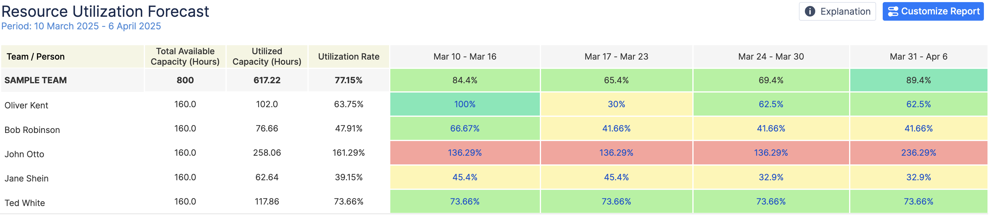 Future Utilization Trends: The report breaks down the utilization rates week by week, giving insights into the team’s workload distribution over time. This allows you to spot under- or over-utilization in advance.
