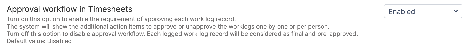 You can enable or disable this option. Disabling the approval workflow will remove the approval requirements and functionalities. You can adjust these settings in the Configurations → Timesheets Config page.
