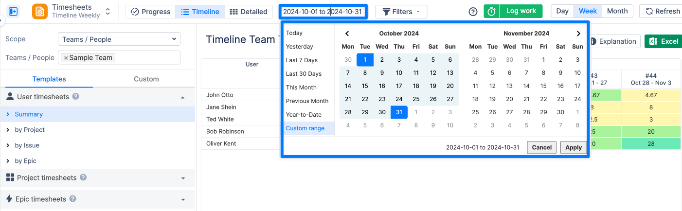 In Timeline Timesheet View you can switch between the daily, weekly, and monthly units to view aggregated information about time spent for a day, week, or month.