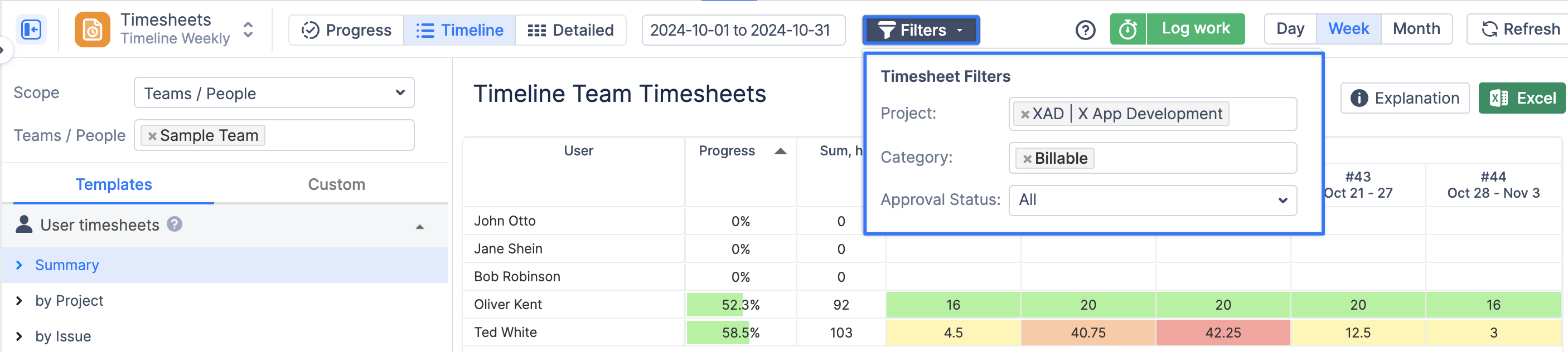 Progress View: Monitor required hours, logged hours, and the completeness of timesheets based on your involvement for any selected period, compare time planned vs time spent, and track approval progress.