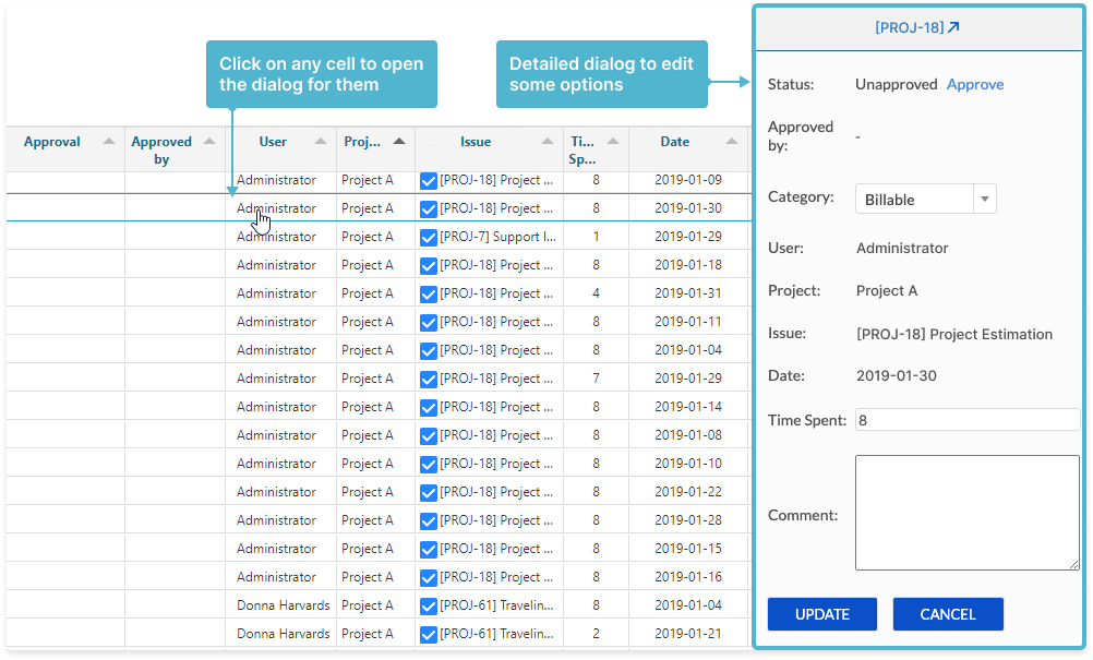 In Worklog panel you can edit Time Spent and Comments; Approve/Unapprove worklogs if the approval process is enabled.
