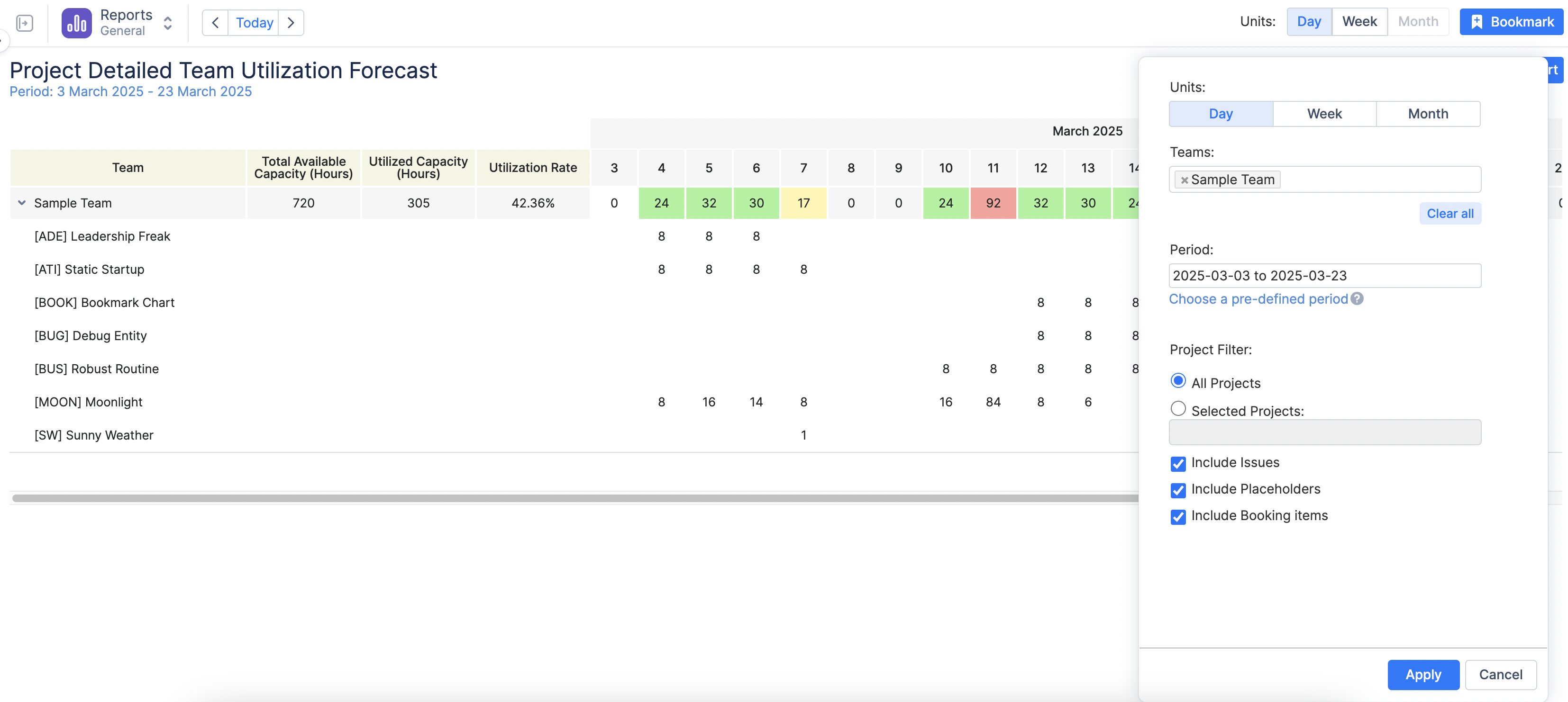Select Data Sources: Choose whether the report should include: Jira Issues, Placeholders, or Bookings.