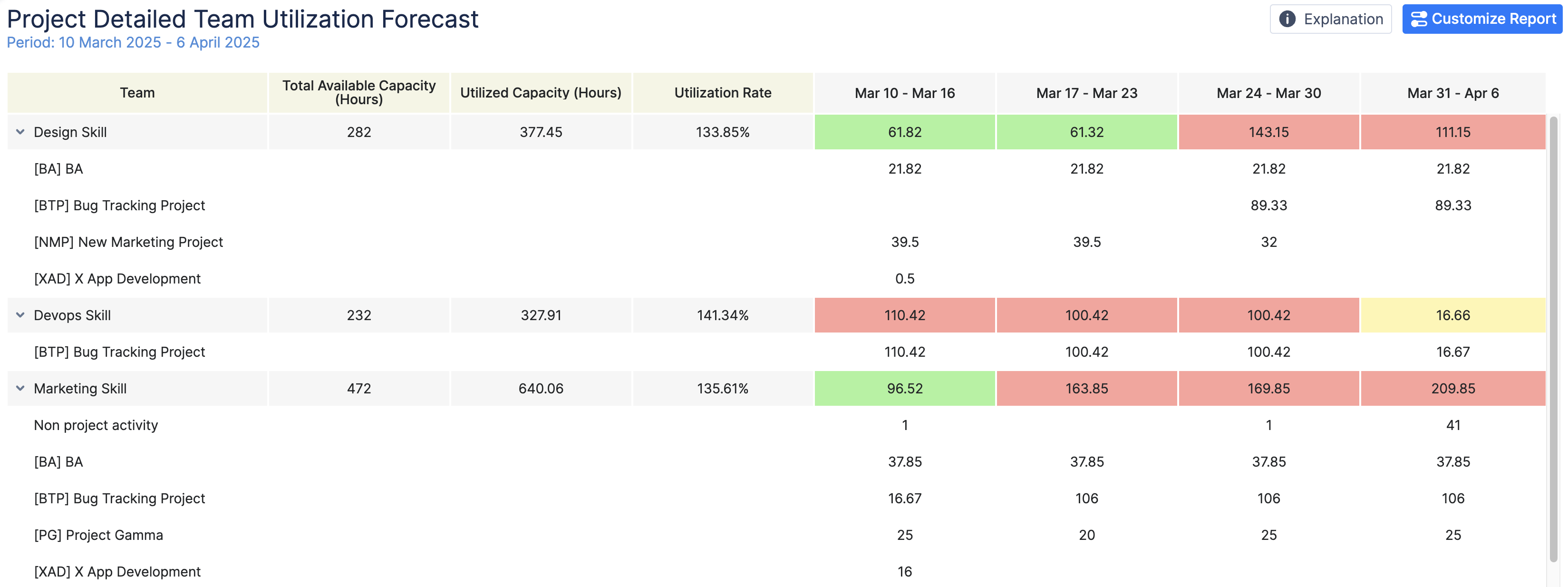 The report is broken down into daily, weekly, or monthly sections, showing how many hours each team is scheduled to work on different projects during the upcoming weeks. This helps to visualize potential under- or over-utilization over time.