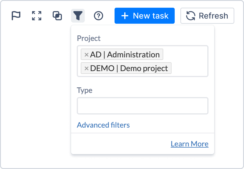 ‘Project’ and ‘Type' filters are available in the dropdown dialog.