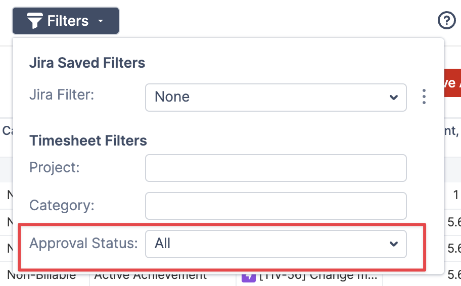 Apply project filters, filter data by worklog category or approval status