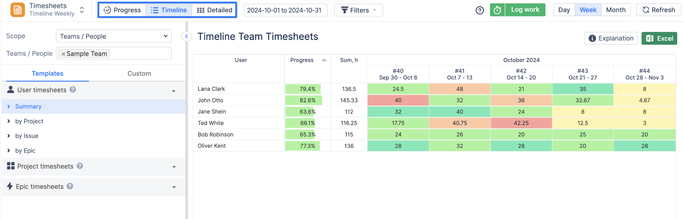 Progress View: Monitor required hours, logged hours, and the completeness of timesheets based on your involvement for any selected period, compare time planned vs time spent, and track approval progress.