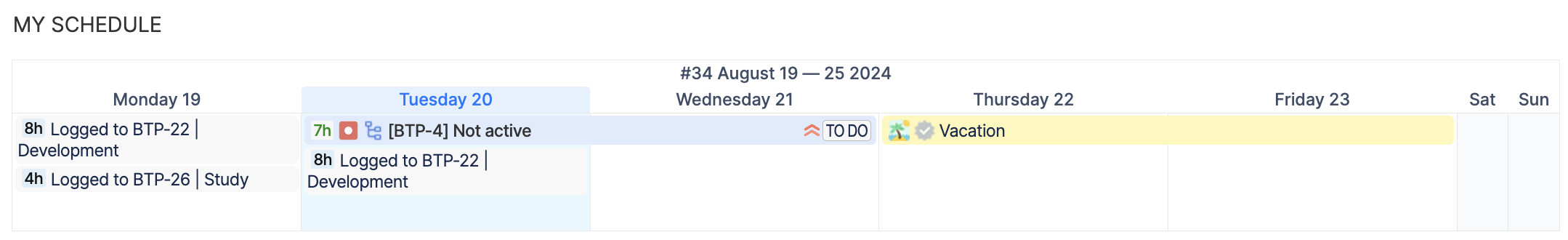 ‘My Schedule’ section gives users a comprehensive look at their daily and weekly tasks, including Jira Issues, custom events, and worklogs. Logged hours are displayed on the day they were recorded, allowing users to easily track their work over time.
