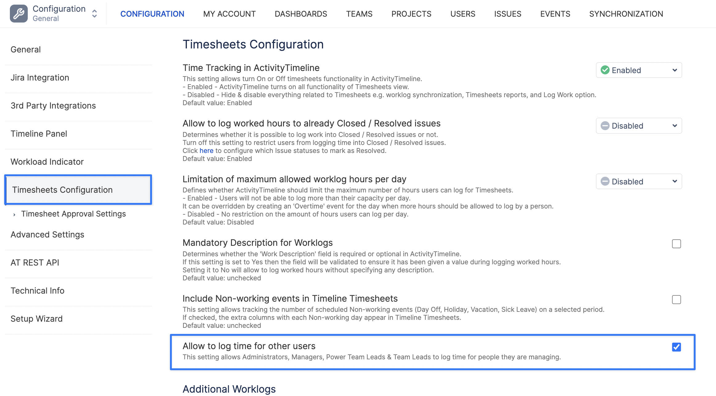 You can enable or disable this feature in Configurations → Timesheet Config → ‘Allow to log time for other users’:
