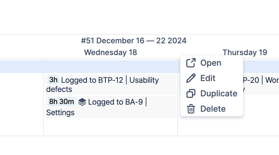 Quick Actions Menu: Click on a worklog on My schedule to access options such as opening the linked issue, editing the worklog, duplicating it, or deleting it: