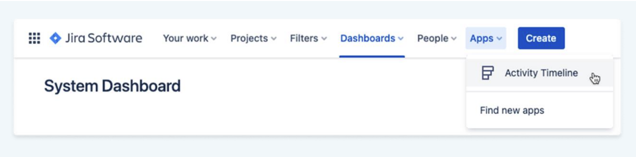 Once installed, you will be able to open ActivityTimeline by navigating to the Jira top menu, selecting ‘Apps,’ and then clicking on ‘ActivityTimeline'.