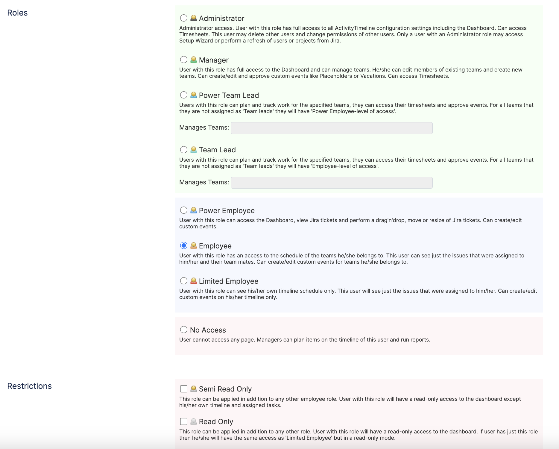 Permission management in ActivityTimeline is done through User Roles which are separate from Jira permission schemes and govern the visibility and actions of the users of ActivityTimeline.